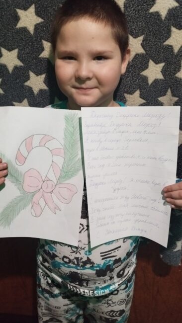 Ciao Nonno Gelo! Sono Vlad K., ho 8 anni. Sono un bambino di una famiglia numerosa. Viviamo nella città di Gorlovka, in una zona bombardata. Ho un altro fratello e una sorella. Desidero un regalo da Te. Aspettiamo il Nuovo Anno e vogliamo la Pace!
